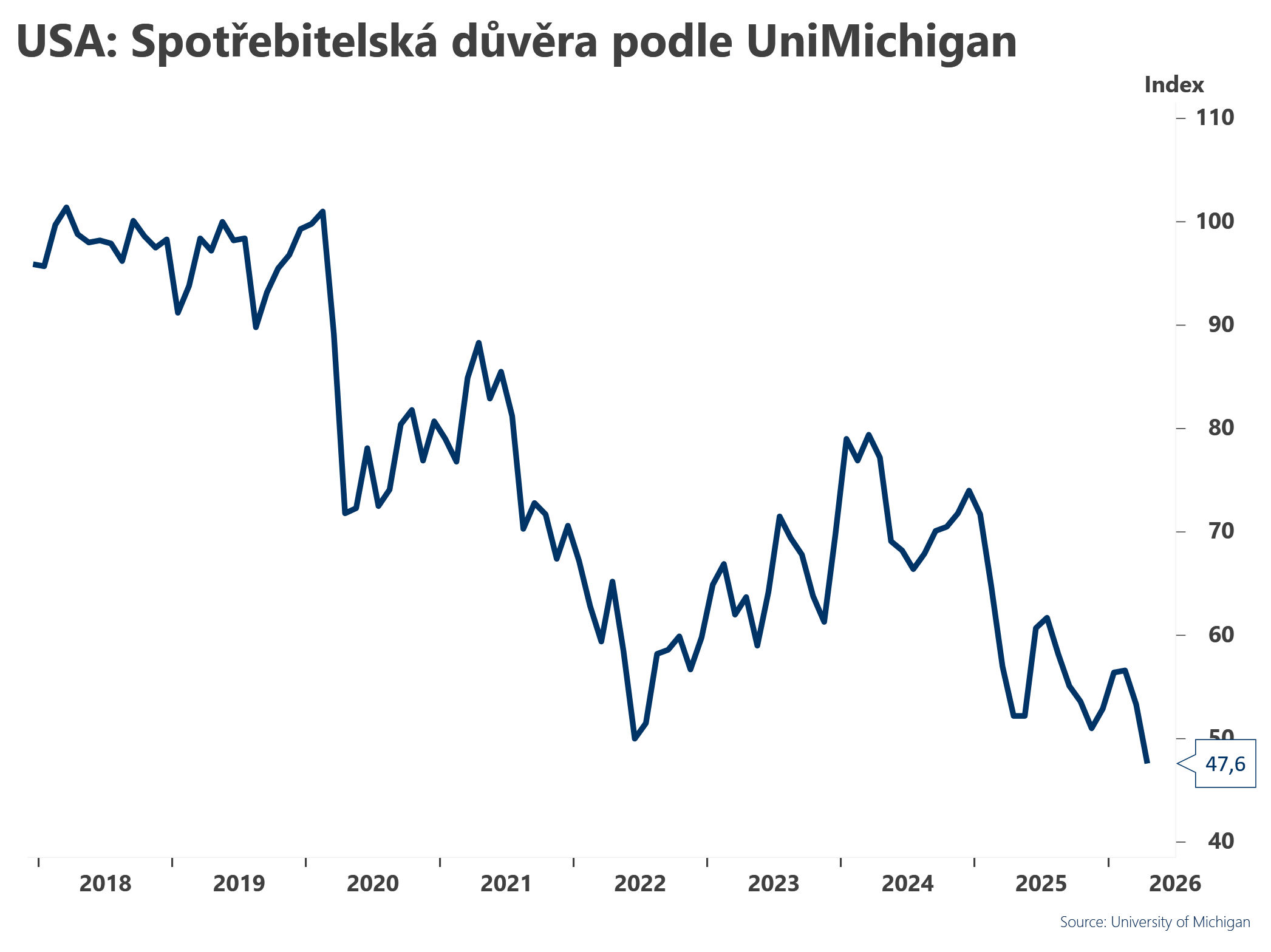 Spotřebitelská důvěra podle UniMichigan klesla (10.4.2026)