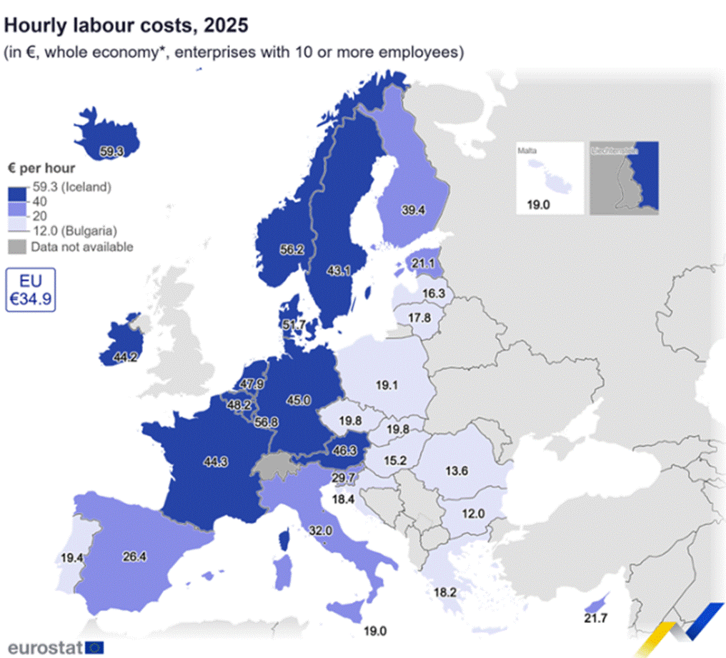 Zatímco v Lucembursku stojí hodina práce přes 1 400 korun (56,8 EUR) a v Dánsku se blíží k třinácti stovkám, český zaměstnanec vyjde firmu v průměru na zhruba 500 korun (19,8 EUR). Stále jsme tedy na necelé polovině toho, co platí němečtí sousedé.