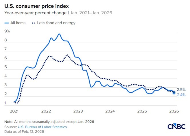 Zpráva o americkém CPI za leden 2026 ukazuje zpomalení celkové inflace, zatímco základní inflační tlaky přetrvávají. Energie poskytly výrazný dezinflanční impulz, avšak náklady v sektoru služeb a některé volatilní položky, jako je cestování