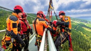 • Hasiči specialisté trénovali záchranu osob na nejdelším visutém mostě světa