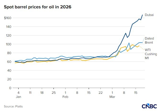 Podle poskytovatele tržních dat, společnosti Platts, ceny dubajské ropy ve čtvrtek v důsledku vývoje konfliktu v Perském zálivu překročily hranici 166 dolarů za barel a dosáhly tak nového rekordního maxima.