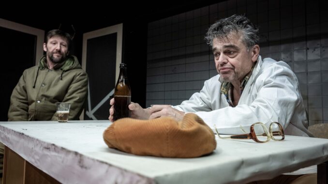Je to doslova napsáno: kdy se které lahve mají otevřít a kdy se má pít. Vytváří to dynamiku scény i určité „propady“, během nichž dochází ke sblížení postav v naší podobě. Otevřu asi deset až dvanáct piv a poctivě vypiju tak sedm až osm. Na rozdíl od pana Landovského já neslezu ze scény a nemám čas si odskočit, tak je to i náročné z tohoto pohledu, a několik hodin před představením nic nepiji. Je asi jasné, že pijeme pito, ale jednu zkoušku jsme zkusili normální pivo a přiznám se, že tu zkoušku jsme nedokončili.