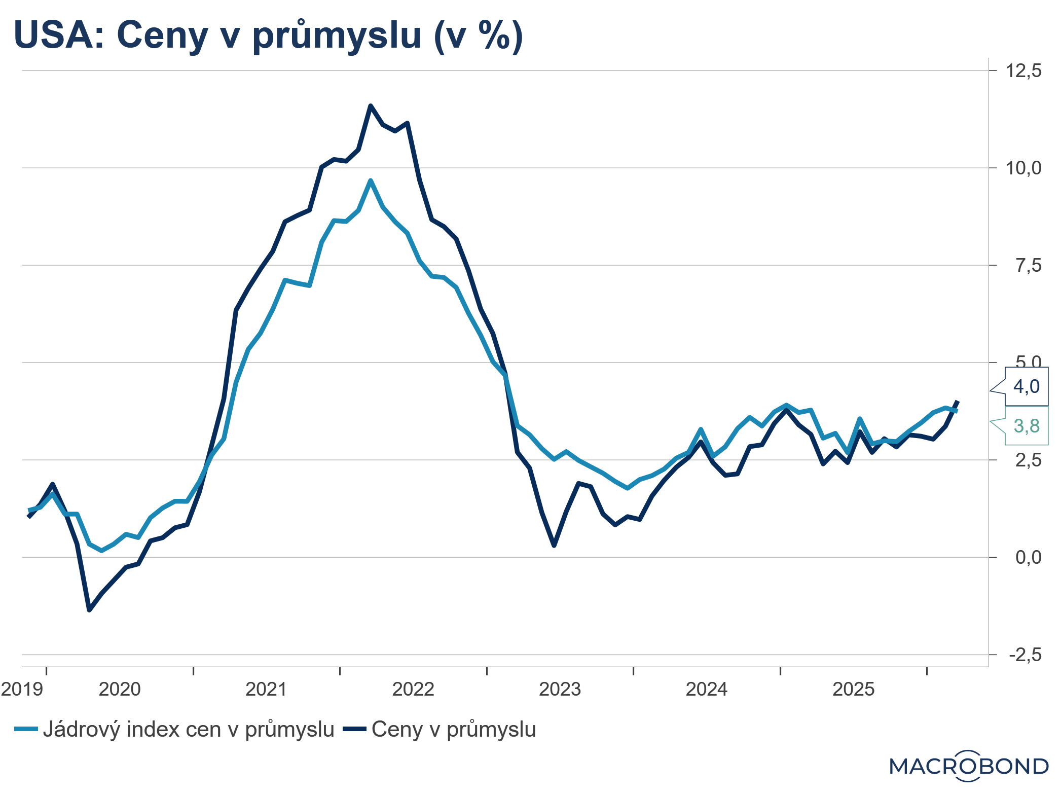 Celkové výrobní ceny v březnu meziročně zrychlily růst na 4,0 % z únorových 3,4 %, přesto však zaostaly za tržním očekáváním ve výši 4,6 %. Jádrový index průmyslových cen naopak mírně zpomalil meziroční tempo růstu na 3,8 % z 3,9 % v únoru