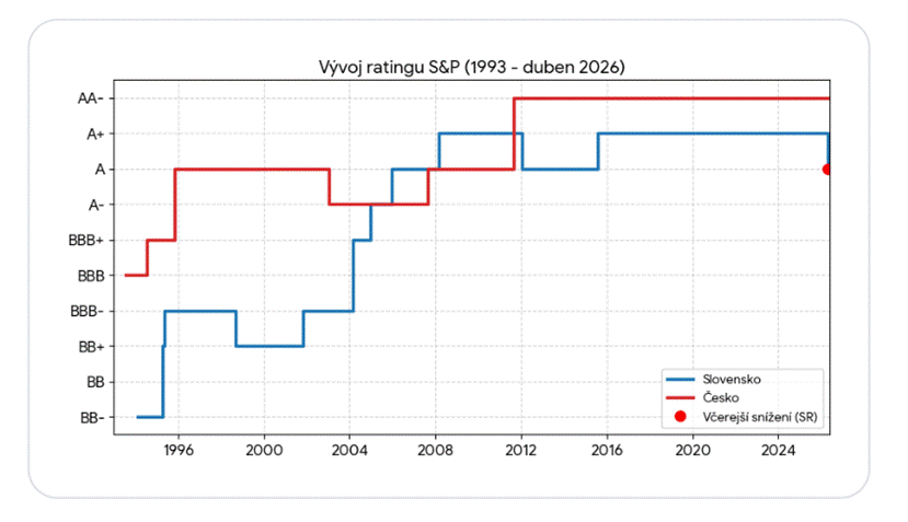 Slovensku zhoršili rating, kvůli stále vysokým deficitům. V porovnání s Českem má nyní nejhorší celkový rating od roku 2002, kdy se ještě sbíralo z éry mečiarismu