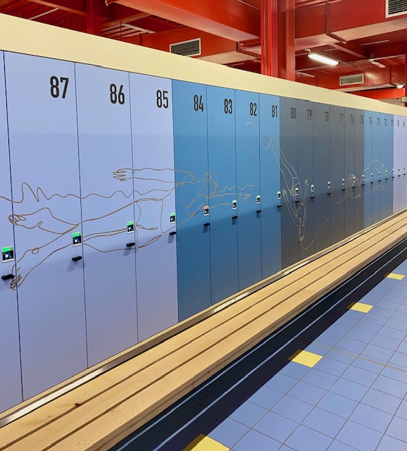 Výměny se dočkají jak pánské, tak dámské skříňky. Nové provedení pracuje s výraznou, ale funkční barevností: pánská část je laděna do modrých odstínů, dámská část přechází od béžové do několika odstínů červené. „Skříňky jsou usazené na stávajících zděných podstavcích s ocelovými konstrukcemi, které firma kompletně zrenovuje. Sedací části laviček, dosud tvořené ocelovými profily, nahradí nové dřevěné latě, které zvýší komfort i estetickou kvalitu prostoru. Součástí plnění byla také odborná demontáž původních skříněk, kabeláže, laviček, které by bránily instalaci nových a také nový odbavovací systém,“ zakončil jednatel SAREZA Jaroslav Kovář.